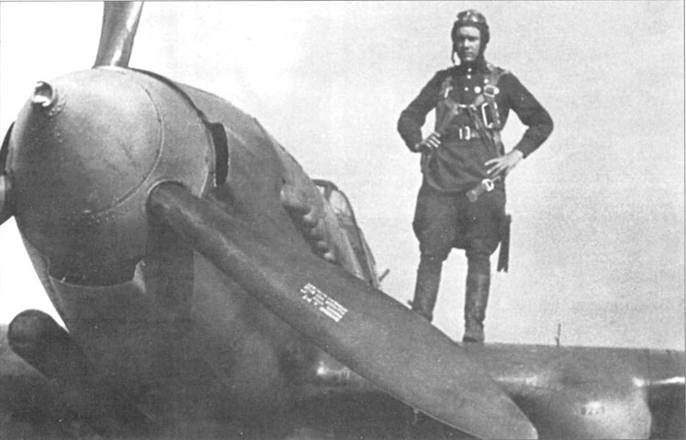 Еще одна дарственная надпись на борту штурмовика И.Ф. Павлова. Он был дважды Героем Советского Союза и на этом снимке, сделанном 16 января 1945 года, позирует вместе со своим стрелком Г.И. Мамыриным. Звание Героя позволяло нанести на борт самолета «объемную» «Кремлевскую» звезду, выполненную двумя оттенками красного цвета. В носовой части этого самолета помер «1» и маленькая красная звезда.