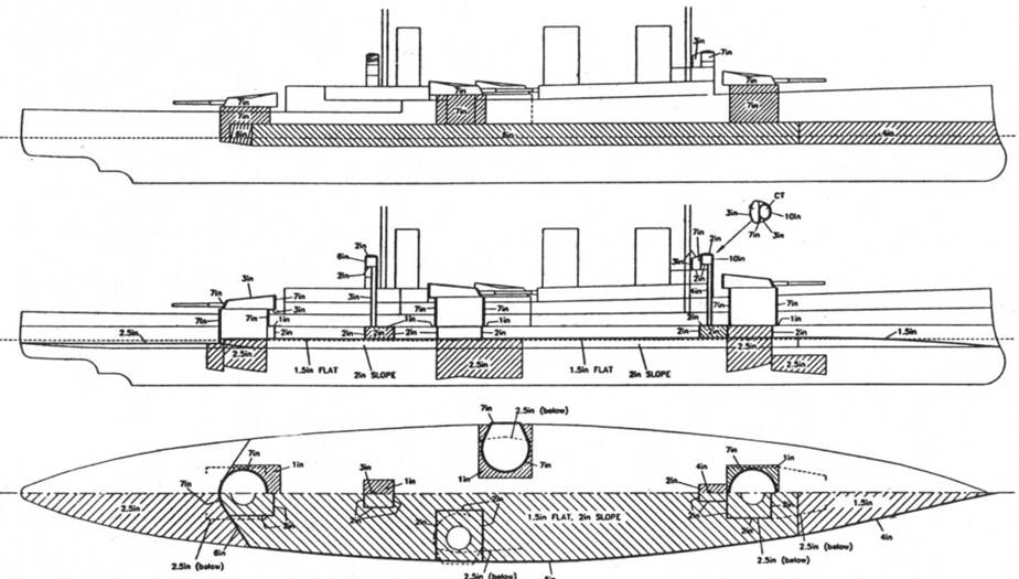 К крейсерам таких же размерений и системы бронирования можно отнести броненосные крейсера, уже имеющие бортовую броню. Это крейсера типа “Дрейк” (4 единицы; вступили в строй в 1902-03 гг.; нормальное/полное водоизмещение 13920/15445 т; 2 234-мм/46,7 кал., 16 152-мм/44,9 кал.; 162,6 х 21,7 х 7,8 м, L/B=7,5; 30000 л.с., 23 уз.), типа “Дюк-оф-Эдинбург” (2 единицы; вступили в строй в 1906 г.; нормальное/полное водоизмещение 12595/14050 т;2 234-мм/46,7 кал., 10 152-мм/44,9 кал.; 154,1 х 22,4 х 7,8 м, L/B=6,88; 23500 л.с., 23 уз.), типа “Уорриор” (4 единицы; вступили в строй в 1903- 04 гг.; нормальное/полное водоизмещение 13240/ 14440 т; 6 234-мм/46,7 кал., 4 190-мм/50 кал.; 154,1 х 22,4 х 8,05 м, L/B=6,88; 23500 л.с., 23 уз.). Заметно изменение системы бронирования между крейсерами типа “Дрейк” и “Дюк-оф-Эдинбург” и в меньшей степени между последним и “Уорриор” при уменьшении высоты главной палубы с расположенными на ней 152-мм орудиями почти до самой ватерлинии.