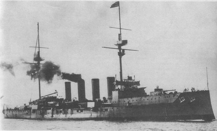 Подобным вооружением и скоростью располагали корабли других крупных морских держав. Франция (“Вальдек-Роше”, 14100 т, 14 194-мм, 23 уз.), Италия (“Сан-Джорджио”, 10164 т, 4 254-мм, 8 190-мм, 23 уз.), Россия (“Рюрик”, 15430 т, 4 254-мм 8 203-мм, 21 уз.) и США (“Теннеси”, 15000 т, 4 254-мм, 16 152- мм, 22 уз.) имели в то время в составе своих флотов броненосные крейсера. Только японские броненосные крейсера “Цукуба” и “Курама” имели на вооружении главный и вспомогательный калибр в составе четырех более крупных 305-мм и восьми 203-мм орудий, но они развивали скорость не более 21-22 уз.