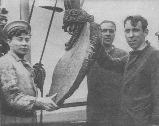 Моряки “Нью Зиланда”с осколком брони барбета от попадания германского снаряда в Ютландском бою.