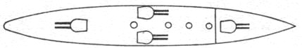 Затем Комитет обсуждал проект под номером “4”, в котором при нормальном водоизмещении 16950 т основные размерения крейсера составляли 164,4 х 23,2 х 7,93 м. Проект возвращался к установке восьми 305-мм орудий в четырех двухорудийных башнях. Из них по одной башне расположили в диаметральной плоскости на полубаке и в корме корабля и еще две на главной палубе в ряд поперек диаметральной плоскости в районе миделя корабля в общей цитадели (обычном редуте). Высота осей стволов орудий над уровнем нормальной ватерлинии составляла для носовой башни 10,4 м, средних башен 9,14 м и кормовой башни 6,4 м. Такое расположение башен обеспечивало по шесть орудий в носовом, бортовом и кормовом залпе. Рассмотрев этот вариант. Комитет без колебания решил, что, так как идеальное размещение артиллерии главного калибра, допускающее ведение одинаково сильного как бортового, так и продольного огня, невозможно, то следует больше уделять внимание сильному бортовому огню, по сравнению с продольным.