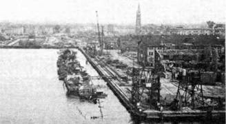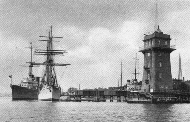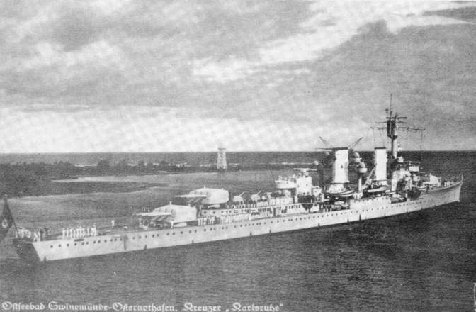 “Карлсруэ” входит в Свинемюнде. 1935 г. (вверху) В базе. Киль 1938 г.