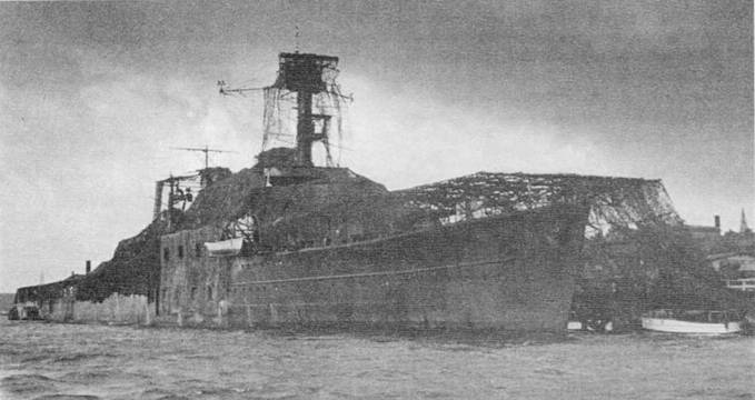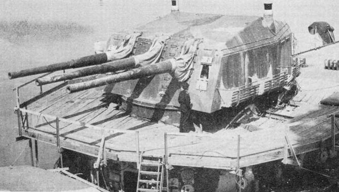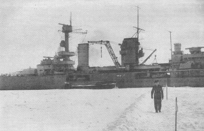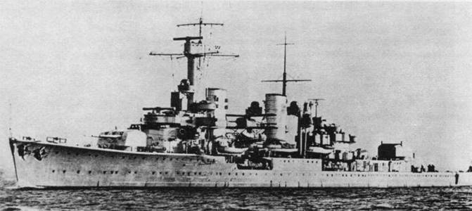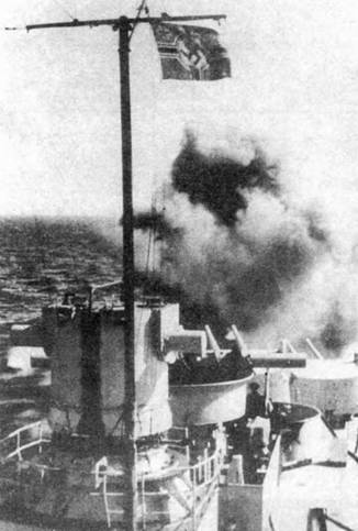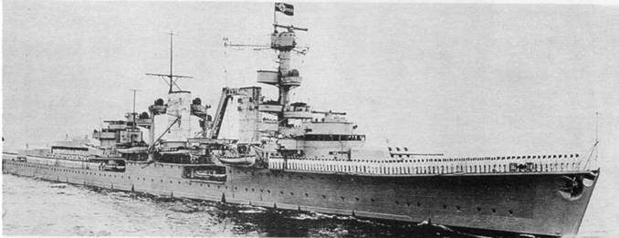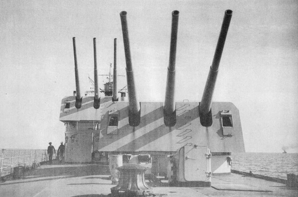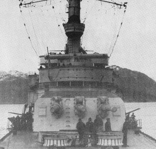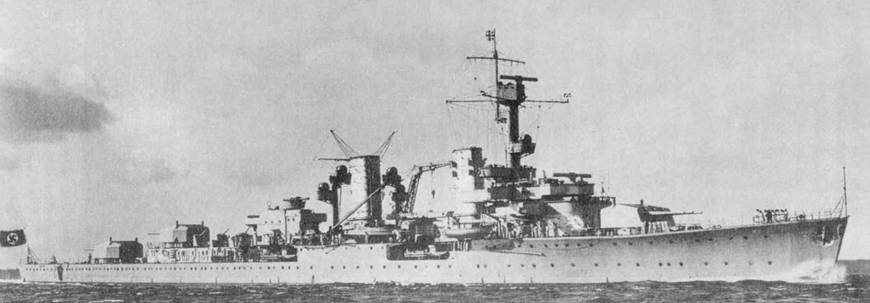 После “Новогоднего боя”, в феврале 1943 г. от этого проекта пришлось отказаться. На крейсере были установлены два счетверенных 20-мм автомата, так называемые “фирлинги”. Они находились на надстройке у бортового 150- мм орудия. Два одноствольных 20-мм автомата были установлены в кормовой части штурманского мостика. Перед отправкой в Скагеракк в августе-сентябре 1944 г. вместо 8 8-мм орудий были установлены 105-мм орудия SKS/32. Характеристики его были следующими: начальная скорость снаряда 780 м.сек., угол возвышения +70°., угол снижения – 10°., живучесть ствола 4100 выстрелов, тип нарезов кубическая парабола, число нарезов 32, вес замка и ствола 1765 кг., дальность стрельбы 15175 м., вес снаряда 15,1 кг., вес заряда 3,8 кг., общий вес патрона 24 кг., вес установки 23650 кг.