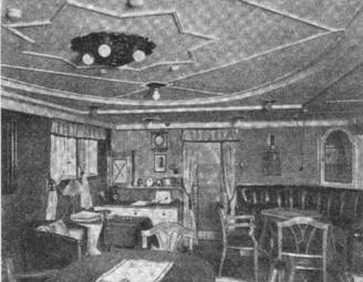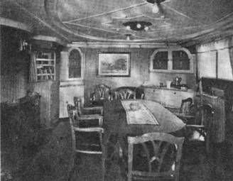 Легкий крейсер “Эмден". На якоре (вверху) и интерьер кают-компании.