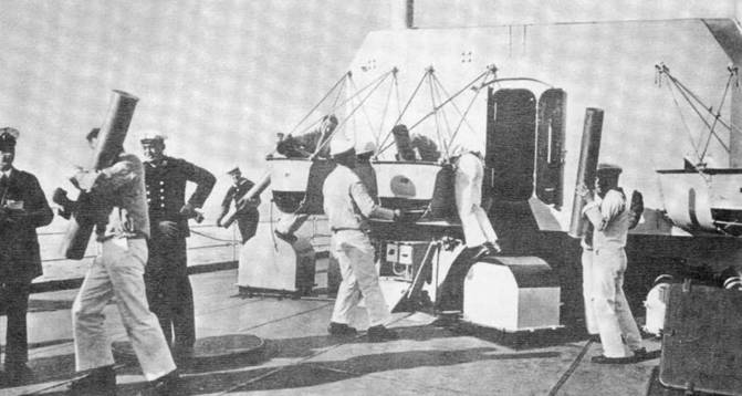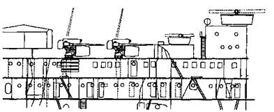 Два 40-мм автомата были установлены на мостике. В результате зенитная артиллерия состояла из 3 105-мм, 2 40-мм автомата системы “Бофорс”, 20 20-мм (2 четырехствольных и 6 двухствольных).