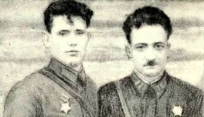 Командир стрелкового батальона капитан Сташкевич А. С. и начальник дивизионного клуба политрук Манский Д. М. (бывший художественный руководитель театра им. Ф. Г. Волкова)