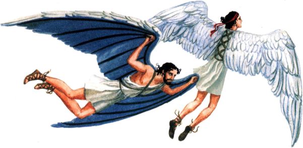 Изобретатель Дедал не только построил лабиринт для Минотавра, изобрёл парус и топор. Он смастерил крылья, чтобы улететь с Крита. Дедал набрал перьев, скрепил их нитками и воском. Затем мастер прицепил одни крылья на спину себе, а другие — сыну Икару.