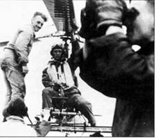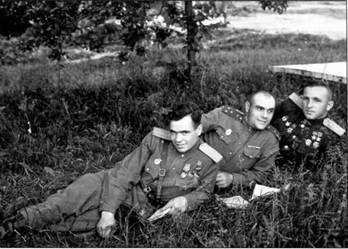Слева – летчики 1-й Гв.ШАД, совершившие 100 и более боевых вылетов. Справа – офицеры 5-го Гв. авиаполка А/Ш накануне операции «Багратион». Слева направо: С.П. Золотарев, Н.Д. Егоров (предположительно) и П.А. Таран