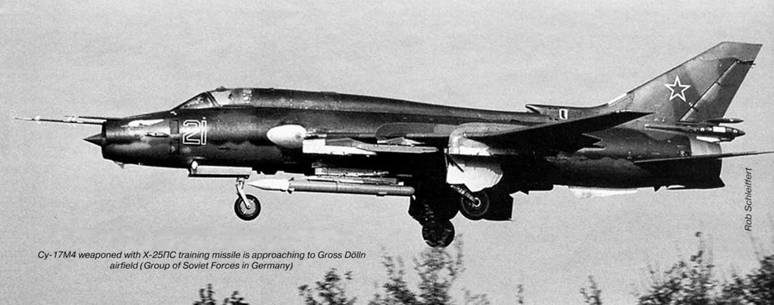 Управляемое ракетное вооружение появилось на Су-17, начиная с самолета № 8923. На машину можно было подвесить две ракеты Х-23 с дальностью пуска 3-10 км. Высота применения ракет составляла 100-5000 м, скорость самолета при пуске – 550-1400 км/ч. Ракета наводилась визуально по трассеру. Летчику нужно было при помощи кнюппеля удерживать Х-23 на линии визирования цели. Аппаратура наведения «Дельта-Н» устанавливалась в носовой конус вместо радиолокационного дальномера. Большой недостаток системы наведения заключался в том, что во время наведения летчик терял контроль за окружающей обстановкой и становился легкой мишенью для средств ПВО противника. Система наведения ракеты была одноканальной, и залповый управляемый пуск двух ракет исключался.