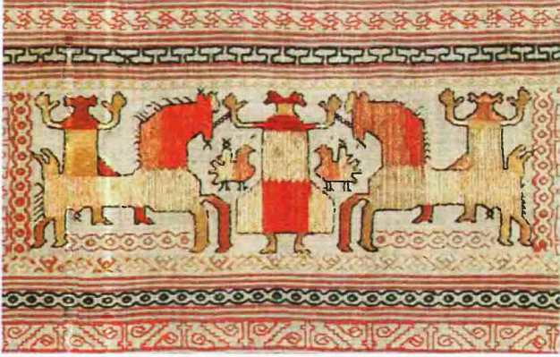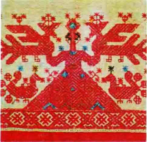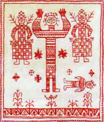 Народная русская вышивка с изображением Рода, двух рожаниц и Велеса