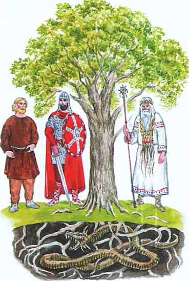 Мировое древо корнами уходило в подземелье, где его грыз змей Аспид. У ствола стоят пахарь воин и волхв. Крона древа поднималась в небо, где жили боги.