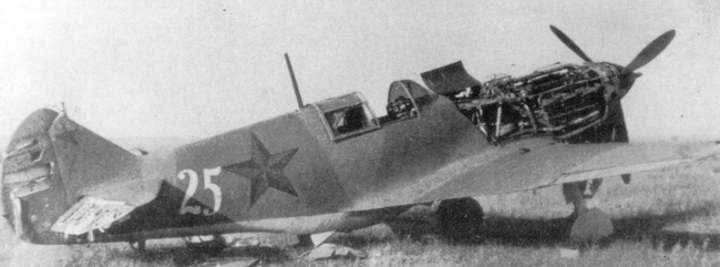 Вынужденная посадка в результате отказа шасси на ЛаГГе-3 5-й производственной серии № 3121565, выпуска завода № 21. Пилотировал самолет Г. М. Иванов, 26 июня 1941 года. Видна широкая антенная мачта.