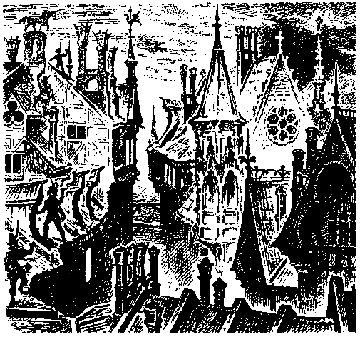 Дьеп, город лип, погрузился в сон. На стенах, у моста, у широких городских ворот стража несла караул. Лодки рыбаков вышли в море. На реке, там, где галеры лежали, словно киты, кормою к причалу, мерцали огоньки, и маяк светился над отмелью. На улицах пахло селедкой и свежей краской — последняя не выветрилась еще со времени приезда шотландской королевы; то тут, то там развевались в темноте забытые флаги с гербом Гизов.
