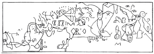 В знахарском мешке сохраняются, конечно, все предметы, которые употребляются при магических операциях; в это число входят различные коренья, из которых иные, может быть, и действительно могут быть применены в качестве лечебного средства, особенно для заживления ран, затем различные части животных и некоторые минералы. Наиболее действительными медицинскими средствами одного старого вождя из племени винебага были, по его собственному заявлению, маленький камешек, который, как оказалось, состоял из куска самородной меди, и кусочек кости, принадлежавшей, как он утверждал, большому врачебному животному. Это животное показывается иногда только знахарям, и то во сне, на земле же не появляется. Здесь прилагается и изображение этого большого врачебного животного, нарисованного рукой этого самого вождя.