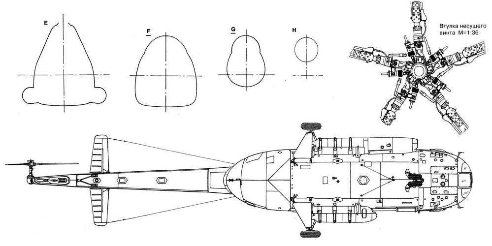 Несущий винт состоит из втулки и пяти лопастей. Втулка НВ имеет разнесенные горизонтальные, вертикальные и осевые шарниры и снабжена гидравлическими демпферами, втулки выполнен из высокопрочной легированной стали. Диаметр втулки — 1,74 м; масса — 610 кг. Лопасти НВ прямоугольной формы в плане с хордой 520 мм. Максимальный угол установки лопастей — 14°30’, минимальный — Г. Контур поперечного сечения лопасти образован профилем NACA- 230 с модифицированной хвостовой частью (задняя кромка профиля приподнята над линией хорды). Относительная толщина профиля — 11,38%. Лопасть выполнена с геометрической круткой — угол превышения линии хорды сечения над базовой плоскостью лопасти меняется вдоль ее размаха по линейному закону от 5" (у комля) до 0" (у законцовки). Лопасть цельнометаллической конструкции, она состоит из алюминиевых лонжерона, 21 хвостового отсека и концевого обтекателя, а также стального комлевого наконечника для крепления к втулке. Масса лопасти — 140 кг. Лонжерон — пустотелая балка с замкнутым контуром, образующая носок лопасти. Хвостовые отсеки трехслойной конструкции с сотовым заполнителем. Они склеены между собой и приклеены к лонжерону. В носке лонжерона располагается противофлаттерный груз, состоящий из восьми отдельных стальных брусков длиной по 400 мм и массой до 1 кг каждый.