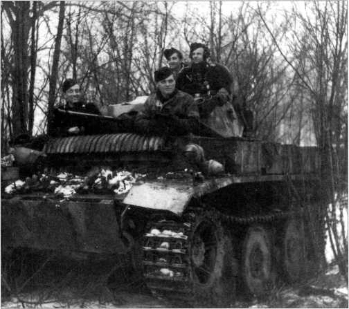 Танк разведки Sd.Kfz.140/1, подбитый во время боев у озера Балатон. Хорошо видно крепление запасных гусеничных танков на лобовом и переднем листах корпуса. Венгрия, февраль 1945 года.