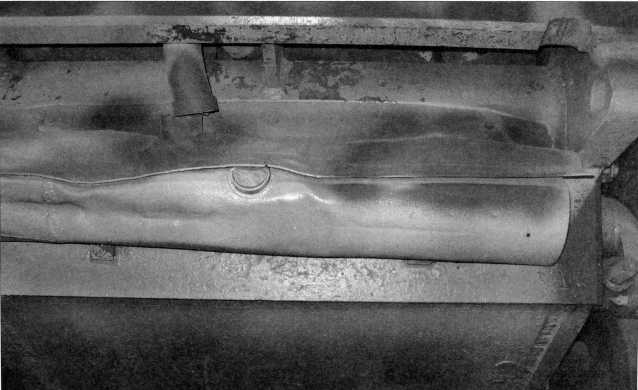 Снимки конструктивного устройства заднего крыла танка Pz.Kpfw.I Ausf.F (там же расположен ящик ЗиП) и надмоторной плиты двигателя «Майбах» HL 45Р. Мощность этого бензинового, карбюраторного, 6-цилиндрового агрегата составляла 150 л.с. Ниже — бортовой люк танка в открытом положении. Фотографии 2009 года.
