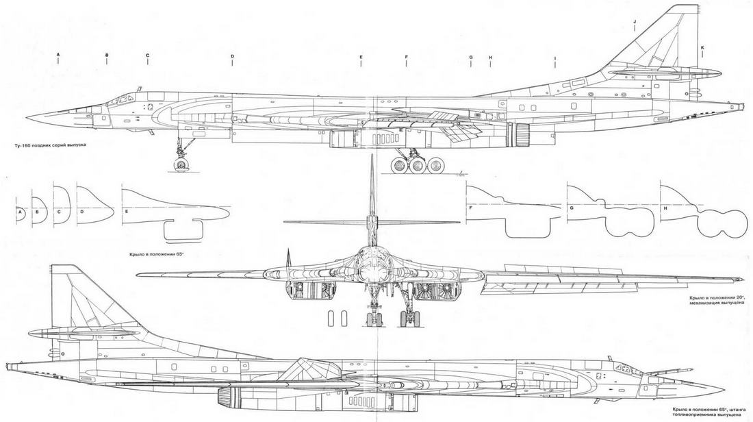 Предельное «обжатие» форм Ту-160 достигнуто также благодаря рациональной конструктивной компоновке (для уменьшения миделя фюзеляжа отсек передней стойки шасси размещен за кабиной экипажа, а не под ней, как на В-1, основные стойки при уборке укорачиваются). Снижению аэродинамического сопротивления способствуют большое удлинение фюзеляжа и плавные обводы его носовой части с сильно скошенными лобовыми стеклами (вначале прорабатывалась установка отклоняемого носового обтекателя по типу Ту-144). Эти меры облегчили достижение заданных скорости и дальности полета и… сделали самолет очень изящным.