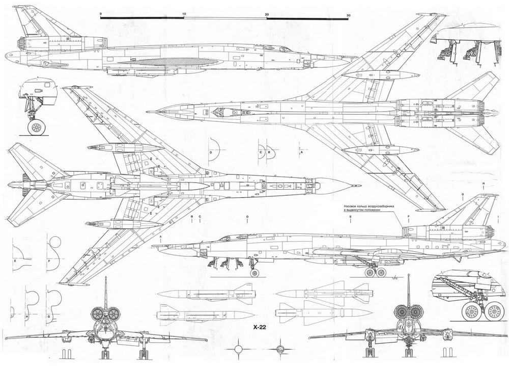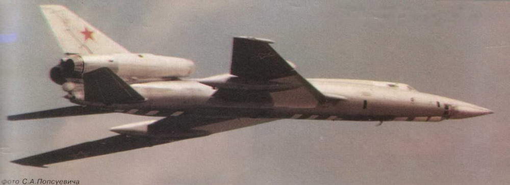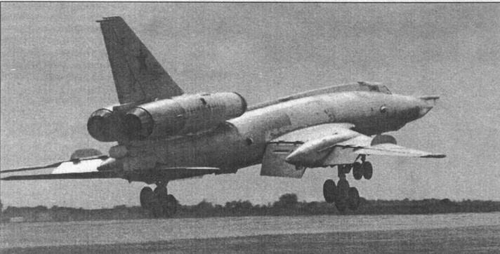 Значительно повысить боевые возможности «двадцать второго» позволила сверхзвуковая крылатая ракета Х-22[* Первоначальное наименование К-22. Имела следующие основные параметры: длина 11,6 м, размах 3 м, стартовая масса около 6000 кг, масса боевой части 1000 кг. В зависимости от траектории полета дальность пуска Х-22 составляла от 150 до 500 км при скорости полета до 4000 км/ч.]. Разработка носителя для нее, получившего обозначение Ту-22К, началась в 1958 г. В мае 1960 г. появился его макет, а в начале 1961 г. был построен первый летный экземпляр (заводской номер 5060045). 6 июля этот самолет с макетом Х-22 под фюзеляжем принял участие в параде над Тушино.