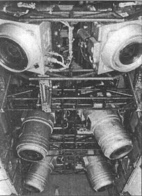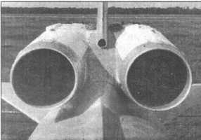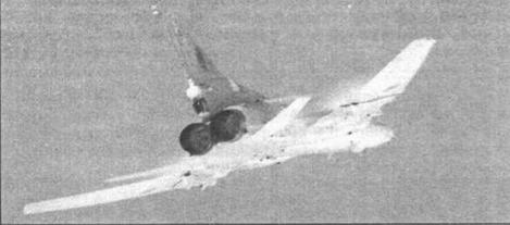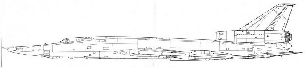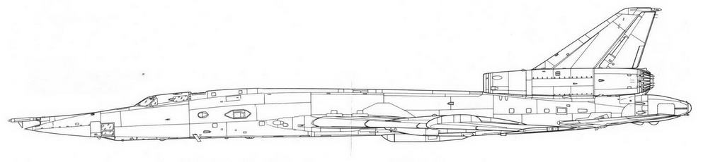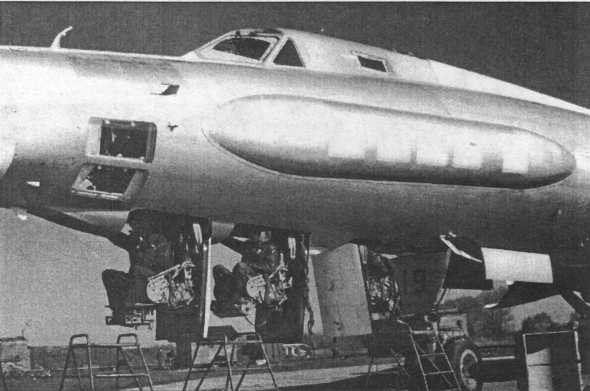 Его фюзеляж имел круглое поперечное сечение с бомбоотсеком за центропланом крыла. У корня оно имело толстый профиль, позволяющий убирать опоры основного шасси в крыло перпендикулярно направлению полета. Принятая компоновка силовой установки позволила сделать форму воздухозаборников наиболее оптимальной, минимизировав потери на входе. При отсутствии каких- либо технических средств обеспечения устойчивой работы на сверхзвуке их максимальное эксплуатационное число М составило 1,5. Высокое расположение двигателей уменьшало вероятность попадания в них посторонних предметов. Эта компоновка имела и немало минусов. Прежде всего, увеличивалась масса планера из-за необходимости усиления хвостовой части фюзеляжа и удлинения по центровочным соображениям носовой части. Значительная эксплуатационная разбежка центровок потребовала принятия ряда мер, обеспечивших продольную устойчивость бомбардировщика на всех режимах полета. Одним из ключевых решений стало оптимальное секционирование топливных баков и обеспечение необходимой очередности их выработки. Удлинение носовой части отрицательно сказалось на характеристиках путевой устойчивости. К тому же значительная высота двигателей над землей затрудняла их обслуживание.