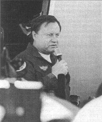 Командир экипажа Ан-70 А. В. Галуненко выступает на митинге после полета