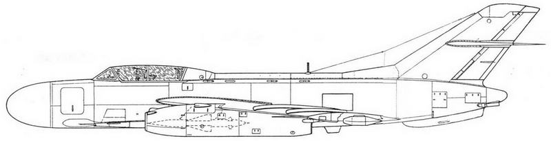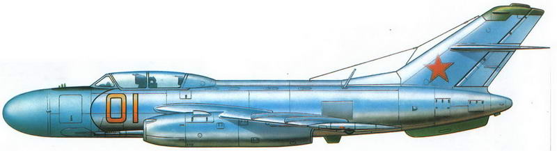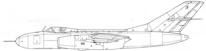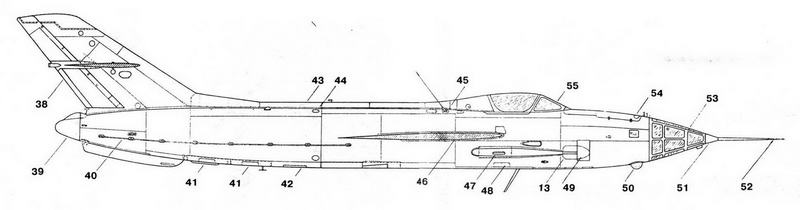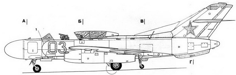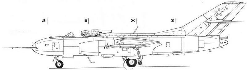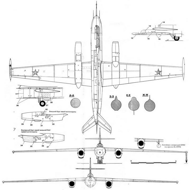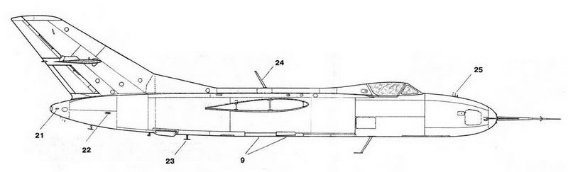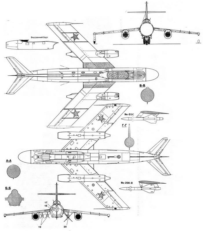 На чертеже представлено типовое нанесение опознавательных знаков и элементов окраски на самолетак Як-25РВ. Весь самолет цвета неокрашенного дюраля, антибликовое покрытие перед фонарем - черное, радиопрозрачная законцовка на киле - зеленая, стойки шасси - серые.
