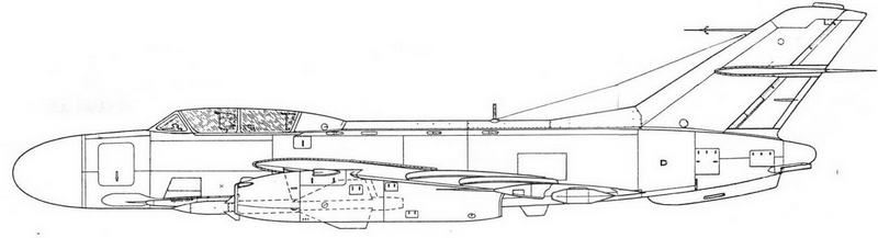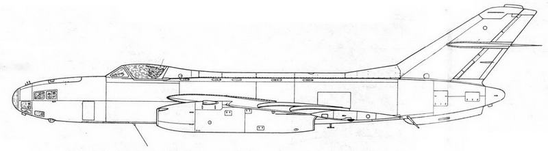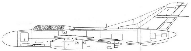На чертеже нанесена типовая схема окраски серийного Як-27Р. Весь самолет цвета неокрашенного дюраля, антибликовое покрытие перед фонарем и на внутренних поверхностях мотогондол - черное гребень под фюзеляжем и радиопрозрачные элементы на киле и крыльях - зеленые, стойки шасси - серье Особенность представленного самолета - красные полосы на крыле и бортовой номер 47.