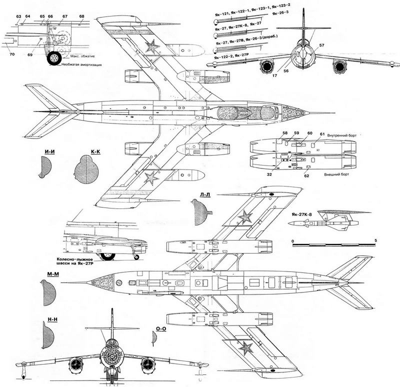 ,-ляр под более мощные двигатели АМ-9А, которые имели форсажный режим Кроме того, новый перехватчик, получивший обозначение Як-120М, должен был оснащаться контейнерами для крупнокалиберных реактивных снарядов[* По современной терминологии - НАР.] АРС-57 и доработанной для стрельбы ими станцией, получившей обозначение «Сокол-М». Самолет, согласно Постановлению Совета Министров СССР №49-34 от 13 января 1954 г., требовалось предъявить на госиспытания в сентябре.