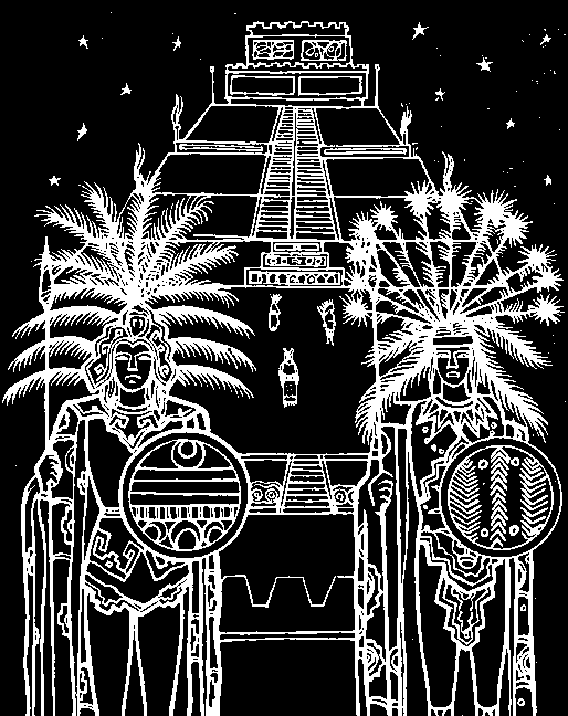 Хочется усомниться во всем. Однако десятки городов, построенных руками индейцев майя, стоят в джунглях до сих пор. Стоит в своей неувядающей красоте город Паленке. В центре города — удивительный Храм солнца с причудливым каменным узором на крыше, большой дворец с высокой башней, где когда-m заседали жрецы-астрономы. На каменных стенах дворца высечены нефритовыми резцами барельефы — воины с копьями в руках, сановники в головных уборах из перьев птиц.