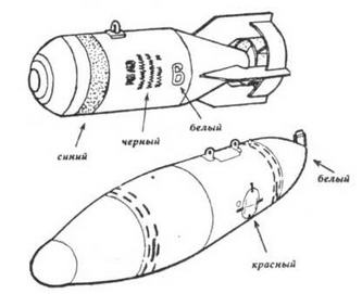 Окраска бомб обычно зеленая, светло-серая или светло- серо-зеленая. Надписи—черные. На осколочно-фугасных СПБ часто наносится кольцевая полоса синего цвета.