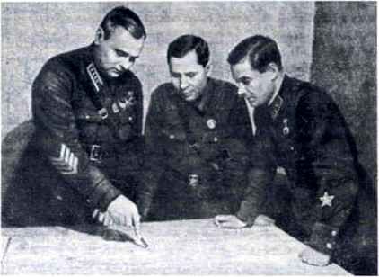 Командующий 7-й армией командарм 2 ранга К.А. Мерецков, члены Военного совета армии Т.Ф. Штыков и дивизионный комиссар Н.Н. Клементьев.