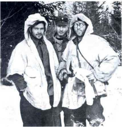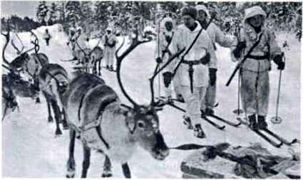Лыжник в маскировочном костюме, выбеленной каске германского образца, лыжных ботинках-пьексах, с надетым нагрудным патронташем. Вооружен карабином и лапландским ножом.
