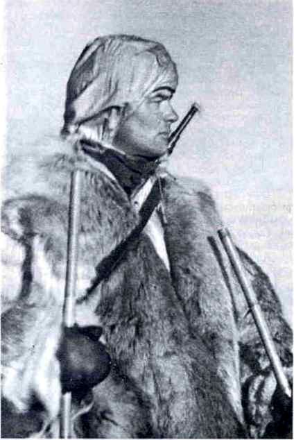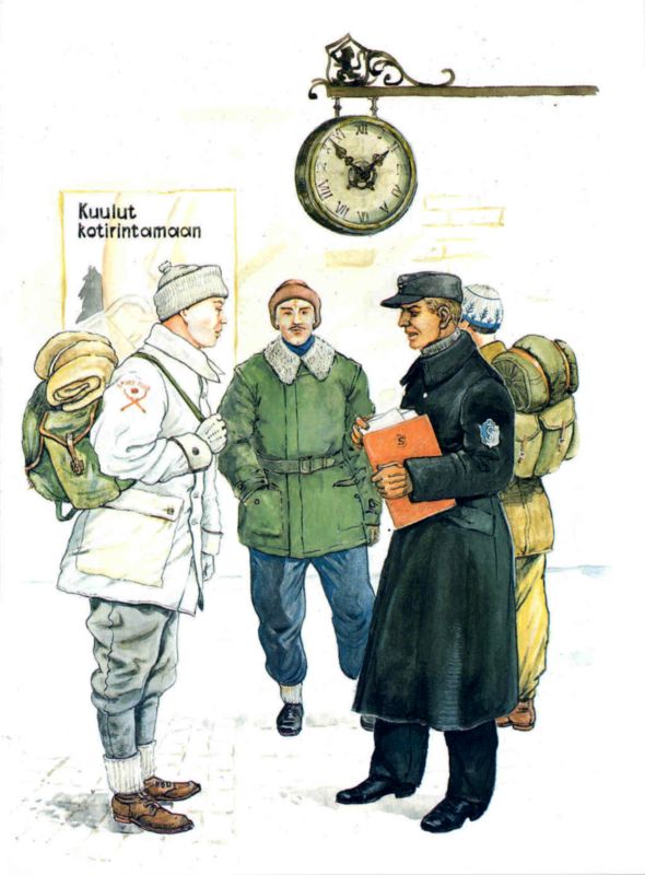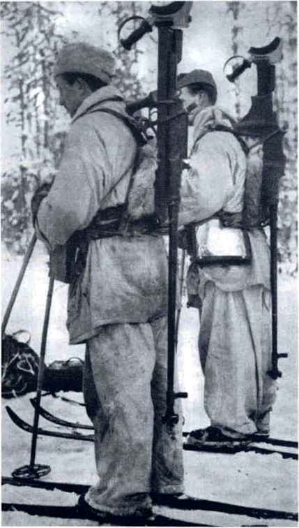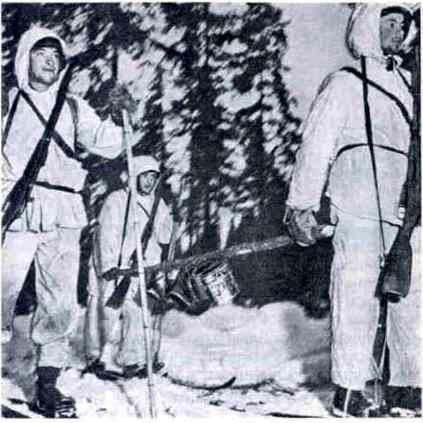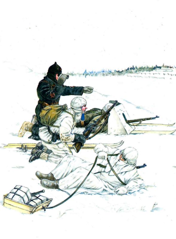 Лыжник-автоматчик с пистолетом-пулеметом «Суоми», обутый в сапоги-пьексы. За спиной — походная выкладка, на голове — финская военная ушанка из белой овчины.