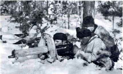 Младший сержант-пулеметчик ведет огонь из пулемета «Лахти-Салоранта». На голове надета каска германского образца 1916/18 гг., на поясе висит штык обр. 1927 г. в кожаной лопасти.