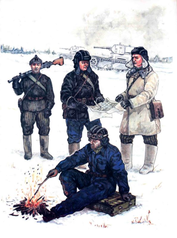 Боец-танкист в мелкопростеганной ватной куртке и штанах, в суконном шлеме, валенках-катанках и перчатках с раструбами, подбитыми овчиной, вооруженный наганом и ручным пулеметом ДП.