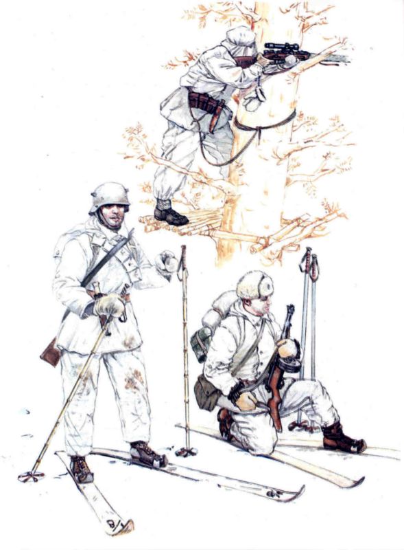 Снайпер-«кукушка» в маскировочном костюме с маской на лице. Обут в лыжные ботинки-пьексы, вооружен финским ножом и снайперской винтовкой обр. 1927 г. На поясе — тройные подсумки немецкого типа.