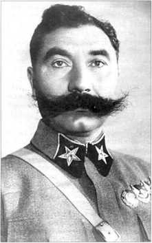 Маршал Советского Союза С. М. Буденный. Хорошо видны фактура шитья петлиц и структура коверкота — ткани гимнастерки. Снаряжение из очень светлой кожи. 1936 г.