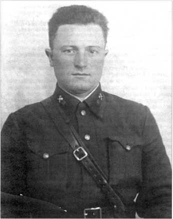 Младший воентехник войск НКВД П.Г. Игнатенко. Планка гимнастерки с открытыми пуговицами, карманы с широкими бантовыми складками. Узкий ремешок параллельно портупейному служит для подвешивания палетки-планшетки. Около 1940 г.