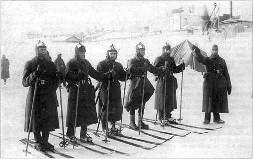 Лыжные соревнования командиров 57-го стрелкового корпуса. Капитан (№ 22) — в башлыке поверх шинели. Видны трехпалые рукавицы и различия в конструкции лыжных креплений. Омск, 1940 г.