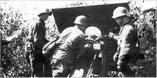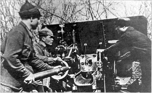 Расчет 122-мм гаубицы на огневой позиции а районе реки Халхин-Гол. На головах бойцов-артиллеристов — стальные шлемы обр. 1936 г. Лето 1939 г.