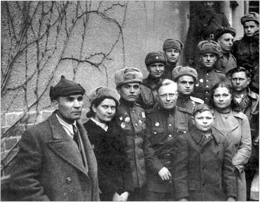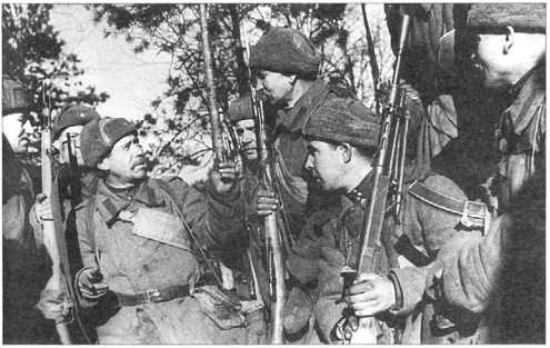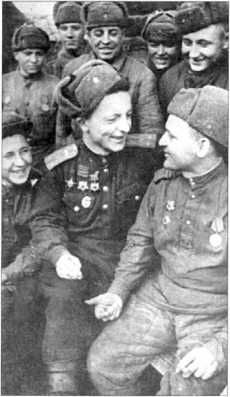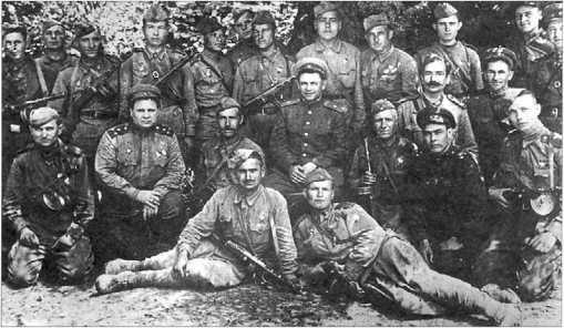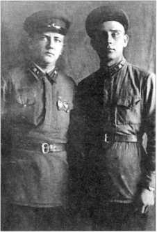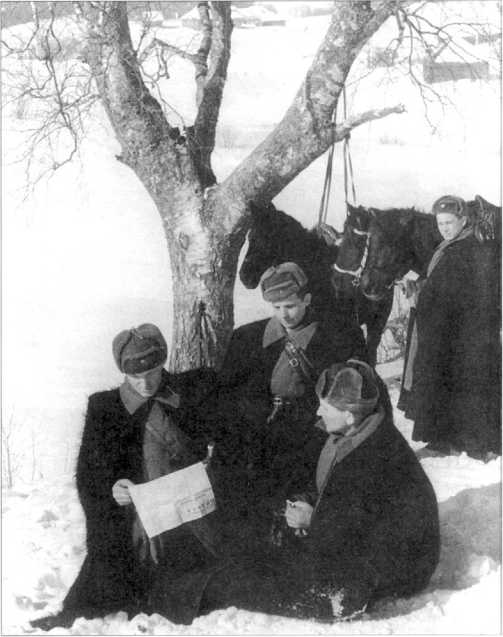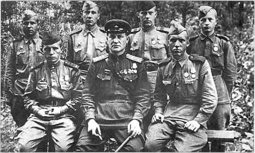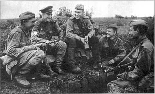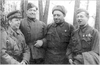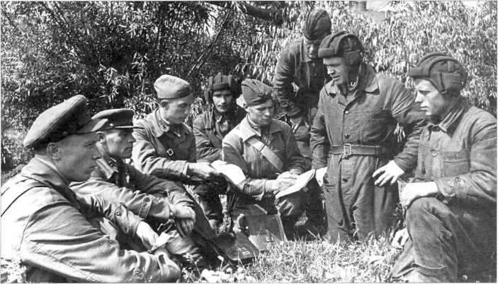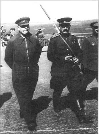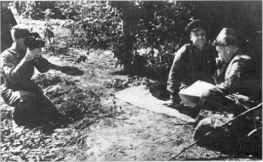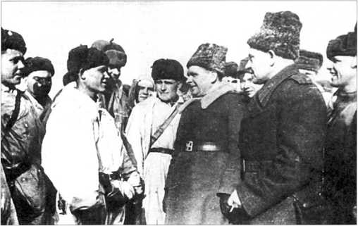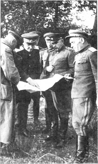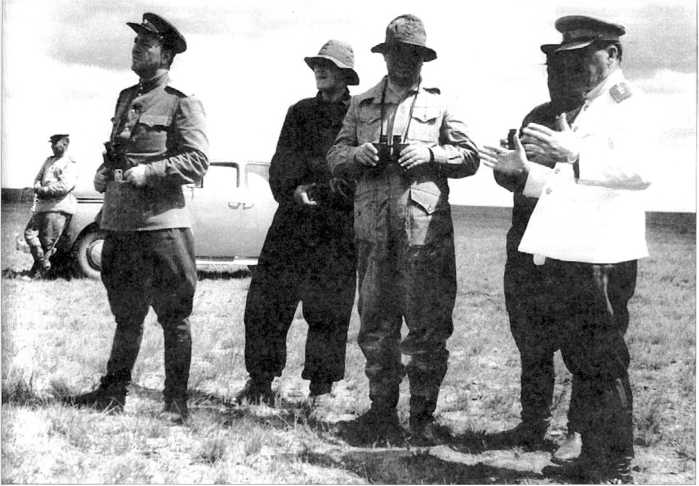 Маршал Советского Союза С. М. Буденный с группой командиров и политработников. На белых внестроевых летных гимнастерках нашиты цветные петлицы и шевроны. На поясе Буденного висят лопасть и пасики для шашки. Карманы гимнастерки полкового комиссара выполнены с бантовыми складками, ремешок часов застегнут поверх манжеты рукава.