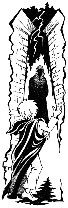 Пролунали звуки горна і, шумно змахнувши великими крилами, зі свого місця над головним вівтарем спустився архангел Михаїл із вогненним мечем у руці. В другій у нього був якийсь позолочений звиток.