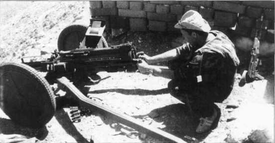Крупнокалиберный ДШК, несмотря на солидный возраст, оставался грозным и популярным оружием, по мощности и прицельной дальности не уступавшим «Утесу», с которым имел общие боеприпасы. Особенно распространен был ДШК в афганской армии, где использовался, помимо обычного станкового варианта, в спаренных и счетверенных установках, монтировавшихся на лафетах с круговым обстрелом. На фото — ДШК на постах у самолетных стоянок Баграма, причем на спаренной турели стоят два пулемета разных моделей.
