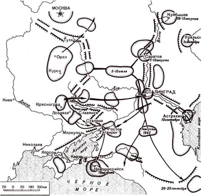 По замыслу немецких стратегов захват Кавказа и важнейших экономических районов Украины, Дона, Кубани, а также перехват волжских коммуникаций отрезал весь плотно населенный промышленный юг и ставил Красную армию и всю Россию в безвыходное положение. Кроме того, по более дальнему замыслу, успешное осуществление этого плана в последующем позволяло немецким группировкам легко продвинуться на север, вверх по Волге до Саратова, Куйбышева (Самары) и далее, и создать условия для удара на Москву из района Курска — Орла с одновременным ударом на нее с запада (схема 2).