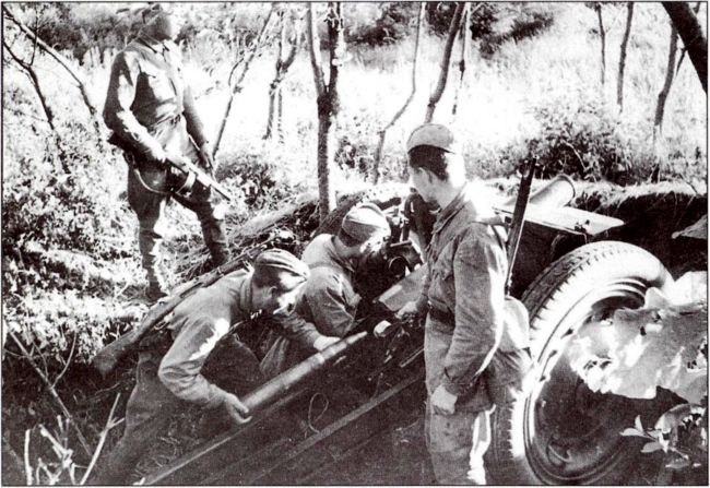 Артиллерийский расчет 76-мм полковой пушки ведет огонь по противнику. Южный фронт. Лето 1942 года.