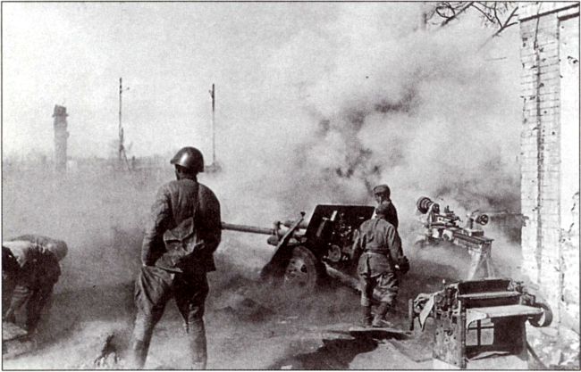 Расчет дивизионной 76-мм пушки ЗИС-З ведет огонь по врагу в Сталинграде. Осень 1942 года.