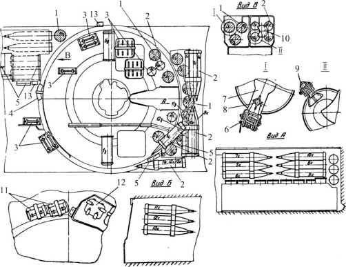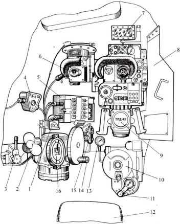 Боевое отделение (место командира): 1 — пулемет ПКТ; 2 — электромашинный стопор пушки; 3 — датчик линейных ускорений; 4 — прибор наблюдения ТНП-160; 5 — прибор ТКН-3; 6 — пополнительный бак; 7 — аппарат ТПУ А-4; 8 — аппарат ТПУ А-1; 9 — пульт загрузки; 10 — распределительный щиток; 11 — радиостанция Р-123М; 12 — спинка сиденья; 13 — блок питания радиостанции.