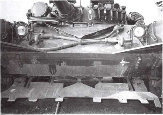 К нижнему броневому листу толщиной 85 мм, наклоненному под углом 60°, приварены бонки для установки оборудования самоокапывания и минного трала.