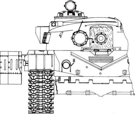 I — фара ФГ-125 ночного прибора механика-водителя; 2 — рычаг поворота; 3 — аппаратура системы защиты от ОМП; 4 — рычаг переключения передач; 5 — подъемный механизм пушки; 6 — прицел-дальномер ТПД-2; 7 — ночной прицел ТПН1-49-23; 8 — осветитель прибора наблюдения ТКН-3; 9 — зенитный пулемет; 10 — механизм подъема кассет;