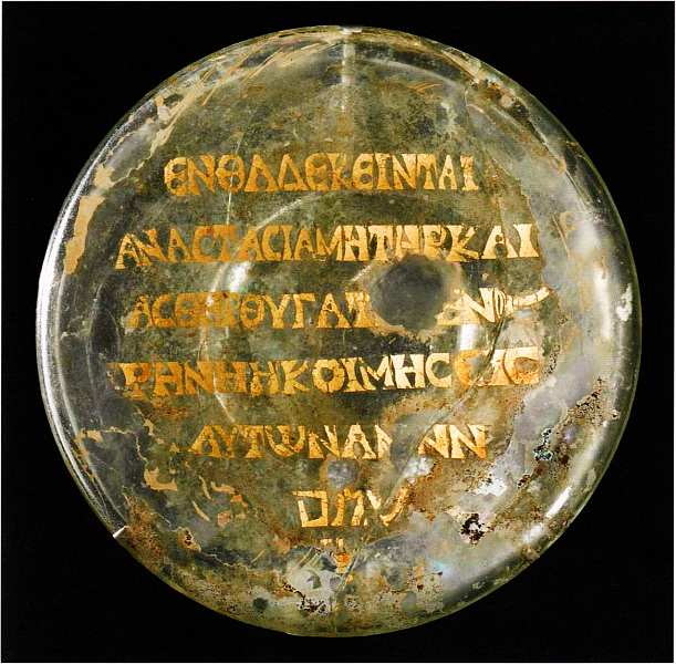 Представленная погребальная табличка выполнена в технике, распространенной в Римской империи в 111-IV веках. В эту эпоху подобным образом украшали медальоны и сосуды: изображение или надпись наносились золотом на стекло (чаще всего они помещались между двух слоев стекла). Чаши, дно которых было декорировано текстом с поздравлениями и пожеланиями здоровья, преподносили друг другу как язычники, так и монотеисты (христиане и иудеи). Часто надписи содержали имена получателей подарков. Кроме того, как правило, стекло украшалось символическими изображениями или орнаментами. Постепенно сложилась практика вмуровывать такие донца в стену склепа, где хоронили владельца ценности.